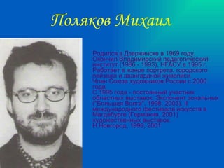 Документ содержит информацию о художниках Дзержинска, включая биографии и достижения Анны Фоминцевой, Светланы Макаровой и Михаила Полякова, а также Сергея Ятнова и других участников художественной жизни города. Описываются их выставки как в России, так и за границей, а также участие в международных фестивалях. Упоминаются также художники-любители и фотохудожники, активно представляющие свои работы на различных выставках.