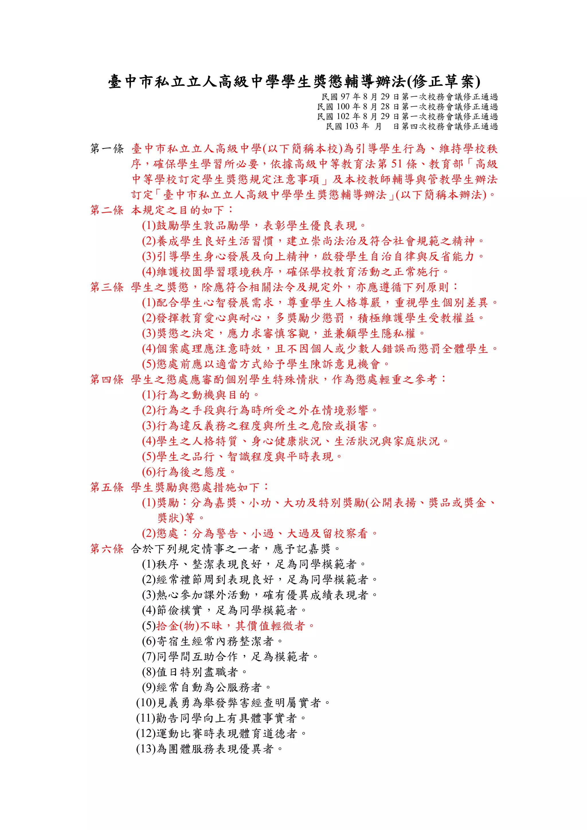 臺中市私立立人高級中學制定學生獎懲輔導辦法,旨在引導學生行為、維持校園秩序及促進學習環境。獎懲措施涵蓋多種類型,包括嘉獎、小功、大功、特別獎勵,以及警告、小過、大過、留校察看等,根據學生的行為表現和特殊情況進行評估。此辦法重視學生的心智發展需求和尊嚴,強調多獎勵少懲罰的教育方針。