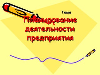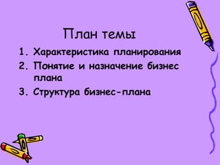 Документ описывает ключевые аспекты бизнес-планирования, включая его назначение, структуру и важность для предпринимательской деятельности. Бизнес-план помогает анализировать идеи, оценивать их реалистичность и привлекать инвесторов. Основные разделы бизнес-плана включают резюме, описание продукта, анализ рынка, оценку конкурентов, стратегию маркетинга, план производства, организационный и финансовый планы.