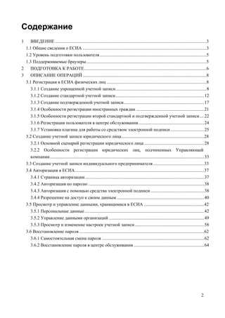 Документ представляет руководство пользователя по системе единой идентификации и аутентификации (ЕСИА) версии 2.2, содержащей информацию о регистрации пользователей, включая физические лица, юридические лица и индивидуальных предпринимателей. В нём описаны этапы регистрации, уровни учетных записей, методы аутентификации и управления данными, а также поддерживаемые браузеры. Также представлены инструкции по работе с системой и по использованию различных услуг, доступных через ЕСИА.
