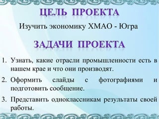 Документ представляет собой проект ученицы о пищевой промышленности Ханты-Мансийского автономного округа. Основное внимание уделяется производству хлеба на Радужнинском хлебозаводе, включая технологии и исторические аспекты. Цель проекта - изучение экономики региона и важности хлеба для человека.
