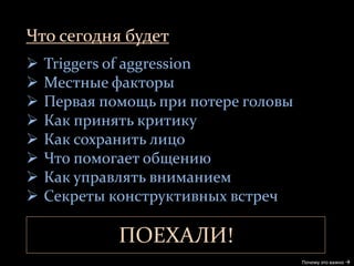 Документ предоставляет советы по управлению агрессией и критикой во время совещаний, рассматривая как внутренние, так и внешние факторы, влияющие на динамику встреч. Автор предлагает техники, такие как с.т.о.п. и в.в.в., для эффективного взаимодействия и управления вниманием участников. Дополнительно он подчеркивает важность конструктивного общения и работает над интересами, а не позициями для достижения решений.