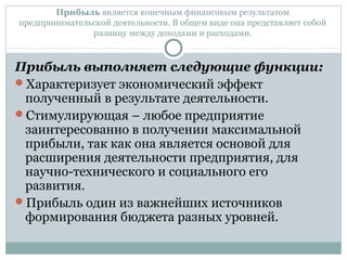 Документ описывает понятие прибыли, ее функции и источники, указывая на то, что прибыль является конечным финансовым результатом предпринимательской деятельности и играет ключевую роль в стимулировании развития предприятий. Он также охватывает составные части налогооблагаемой прибыли, включая доходы и расходы от основной и неосновной деятельности. Рентабельность рассматривается как важный показатель эффективности производства, позволяющий оценить уровень отдачи затрат и использование ресурсов.