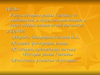 Документ описывает историю улицы Галкина и её связь с героем Советского Союза Владимиром Александровичем Галкиным, который родился в 1908 году и участвовал в Великой Отечественной войне. Замечается, что Галкин командовал танковым полком и совершил героические поступки в боях, за что был награжден и увековечен в памяти города Дзержинск. В документе также перечисляются значимые здания и учреждения на улице Галкина.