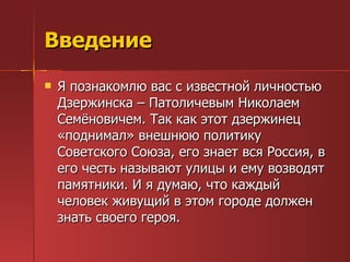 Патоличев Николай Семёнович - известная личность Дзержинска, сыгравший важную роль в внешней политике СССР и памятный герой города. Он родился в 1908 году, стал дважды Героем Социалистического Труда, а также занимал высокие посты, включая министра внешней торговли. Цель работы состоит в изучении его биографии и вклада в продовольственную деятельность СССР.