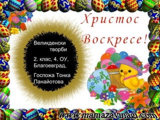 Великден Великден еголям празник. На него се боядисват яйца. Първото се боядисва с червен цвят и с него се потъркват бузките на децата за здраве. Правят се козунаци и питки. Кристина Ковачка