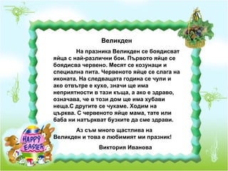 Великден На празникаВеликден се боядисват яйца с най-различни бои. Първото яйце се боядисва червено. Месят се козунаци и специална пита. Червеното яйце се слага на иконата. На следващата година се чупи и ако отвътре е кухо, значи ще има неприятности в тази къща, а ако е здраво, означава, че в този дом ще има хубави неща.С другите се чукаме. Ходим на църква. С червеното яйце мама, тате или баба ни натъркват бузките да сме здрави. Аз съм много щастлива на Великден и това е любимият ми празник! Виктория Иванова