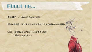 Oobayashi 2014年4月 デジタルサーカス会社に入社(WEBチーム所属) Like! 絵を描いたりアニメーションを作ったり 4色ボールペンアート