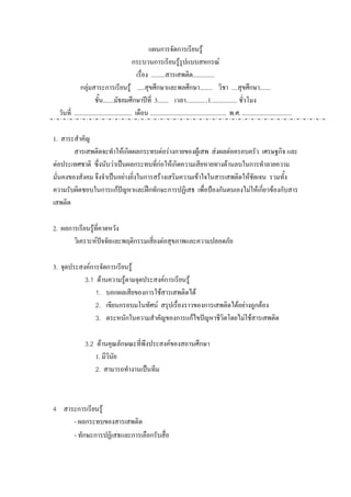 กระบวนการเรียนรูรูปแบบสหกรณ เรื่อง .........สารเสพติด.............. กลุมสาระการเรียนรู .....สุขศึกษาและพลศึกษา........ วิชา ....สุขศึกษา....... ชั้น.......มัธยมศึกษาปที่ 3....... เวลา..............1................. ชั่วโมง วันที่ ..................................... เดือน ................................................. พ.ศ. ................................ 1. สาระสําคัญ สารเสพติดจะทําใหเกิดผลกระทบตอรางกายของผูเสพ สงผลตอครอบครัว เศรษฐกิจ และ ตอประเทศชาติ ซึ่งนับวาเปนผลกระทบทีกอใหเกิดความเสียหายทางดานลบในการทําลายความ ่ มั่นคงของสังคม จึงจําเปนอยางยิ่งในการสรางเสริมความเขาใจในสารเสพติดใหชดเจน รวมทั้ง ั ความรับผิดชอบในการแกปญหาและฝกทักษะการปฏิเสธ เพื่อปองกันตนเองไมใหเกี่ยวของกับสาร เสพติด 2. ผลการเรียนรูที่คาดหวัง วิเคราะหปจจัยและพฤติกรรมเสี่ยงตอสุขภาพและความปลอดภัย 3. จุดประสงคการจัดการเรียนรู 3.1 ดานความรูตามจุดประสงคการเรียนรู 1. บอกผลเสียของการใชสารเสพติดได 2. เขียนกรอบมโนทัศน สรุปเรื่องราวของการเสพติดไดอยางถูกตอง 3. ตระหนักในความสําคัญของการแกไขปญหาชีวิตโดยไมใชสารเสพติด 3.2 ดานคุณลักษณะที่พึงประสงคของสถานศึกษา 1. มีวินัย 2. สามารถทํางานเปนทีม 4 สาระการเรียนรู - ผลกระทบของสารเสพติด - ทักษะการปฏิเสธและการเลือกรับสื่อ