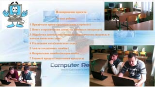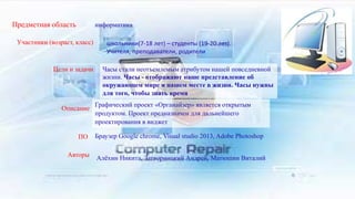 Документ описывает проект по созданию графического органайзера, направленного на интеграцию с браузером Google Chrome и другими программами. Участниками проекта являются школьники и студенты, которые прошли через этапы планирования, разработки и тестирования кода. Основное внимание уделено важности электронных часов в современном обществе и их повсеместному применению в различных устройствах.