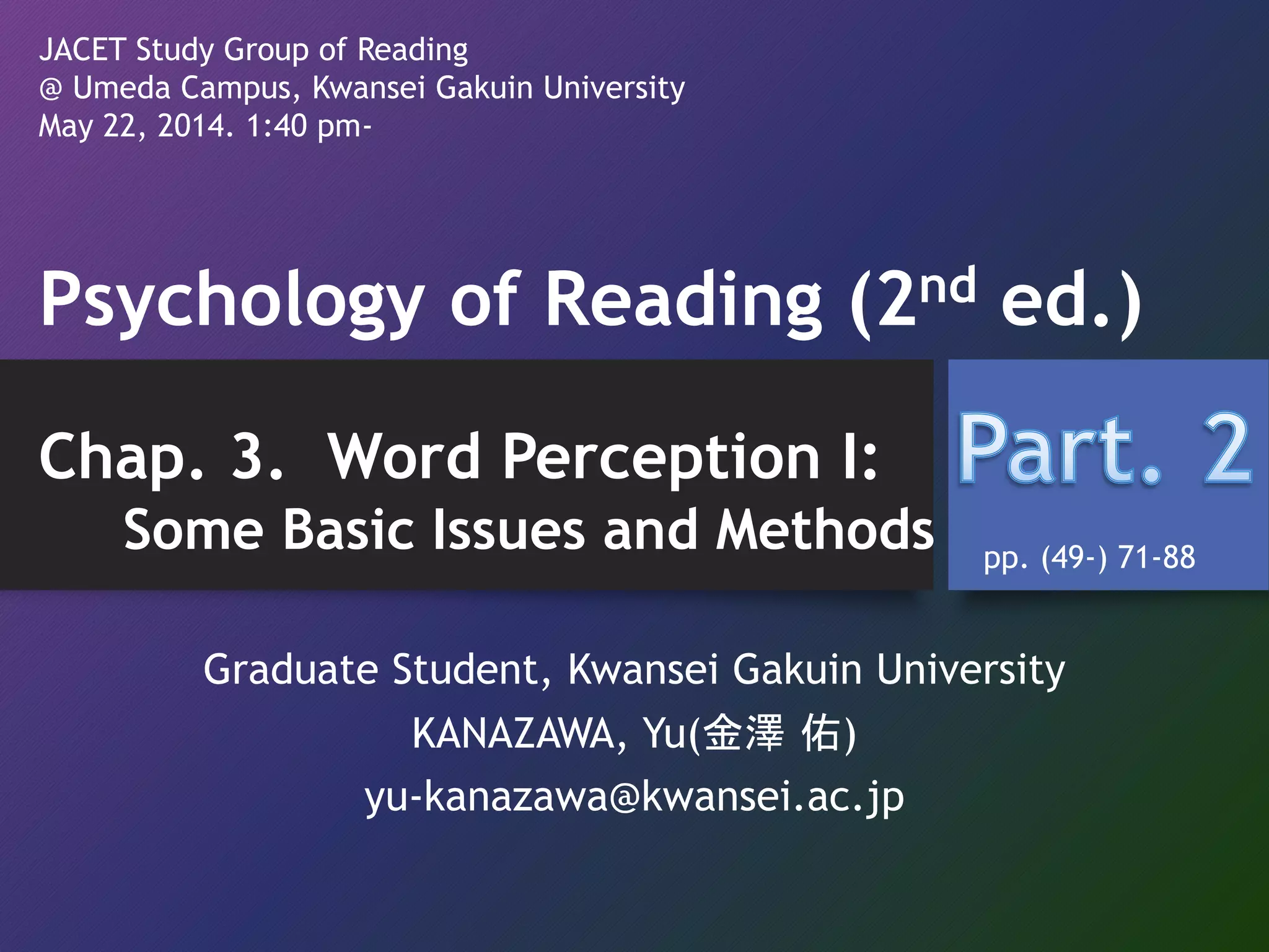 The document summarizes key topics from Chapter 3 of Psychology of Reading (2nd ed.) regarding word perception. It discusses:
