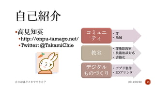 地域 コミュニ ティ • IT機器教室 • 技術相談対応 • 書籍化 教室 • アプリ製作 • 3Dプリンタ デジタル ものづくり 2014/06/22音声認識どこまでできる? 2
