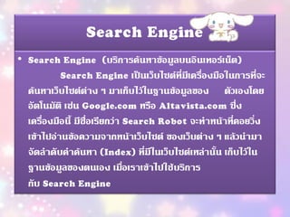Engine (บริการค้นหาข้อมูลบนอินเทอร์เน็ต) Search Engine เป็นเว็บไซต์ที่มีเครื่องมือในการที่จะ ค้นหาเว็บไซต์ต่าง ๆ มาเก็บไว้ในฐานข้อมูลของ ตัวเองโดย อัตโนมัติ เช่น Google.com หรือ Altavista.com ซึ่ง เครื่องมือนี้ มีชื่อเรียกว่า Search Robot จะทาหน้าที่คอยวิ่ง เข้าไปอ่านข้อความจากหน้าเว็บไซต์ ของเว็บต่าง ๆ แล้วนามา จัดลาดับคาค้นหา (Index) ที่มีในเว็บไซต์เหล่านั้น เก็บไว้ใน ฐานข้อมูลของตนเอง เมื่อเราเข้าไปใช้บริการ กับ Search Engine
