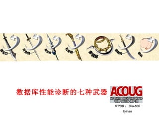 等待事件 熟悉各种主要的等待事件 ,快速定位问题所在 Top 5 Timed Events Avg %Total ~~~~~~~~~~~~~~~~~~ wait Call Event Waits Time (s) (ms) Time Wait Class ------------------------------ ------------ ----------- ------ ------ ---------- wait for a undo record 35,928 3,451 65 50.1 Other CPU time 1,687 24.4 db file scattered read 392,504 821 11.7 User I/O wait for stopper event to be i 4,027 278 69 3.4 Other log file sync 28,880 171 2.1 Commit wait for a undo record 等待与回滚段的大量回滚有关,一般是出现了大事务回退造成 select sid, event, wait_class from v$session_wait s where s.event not like ‘%message%’; SID EVENT WAIT_CLASS ------------------- ---------------------------------------------------------------- 507 PX Deq: Txn Recovery Start Idle 511 PX Deq: Txn Recovery Start Idle 268 PX Deq: Txn Recovery Start Idle …… select pid, state, undoblocksdone from v$fast_start_servers; PID STATE UNDOBLOCKSDONE ---------- ----------- -------------- 133 RECOVERING 7124 ……