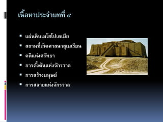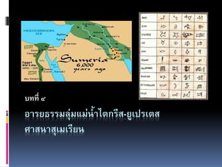 ดาวน์โหลดไฟล์นี้ได้ที่ www.philosophychicchic.com ศาสนาโบราณ ศาสนาสุเมเรียน เนื้อหาประจำบทที่ ๔ แผ่นดินเมโสโปเตเมีย สถานที่เกิดศาสนาสุเมเรียน คติแห่งศรัทธา การตั้งต้นแห่งจักรวาล การสร้างมนุษย์ การสลายแห่งจักรวาล