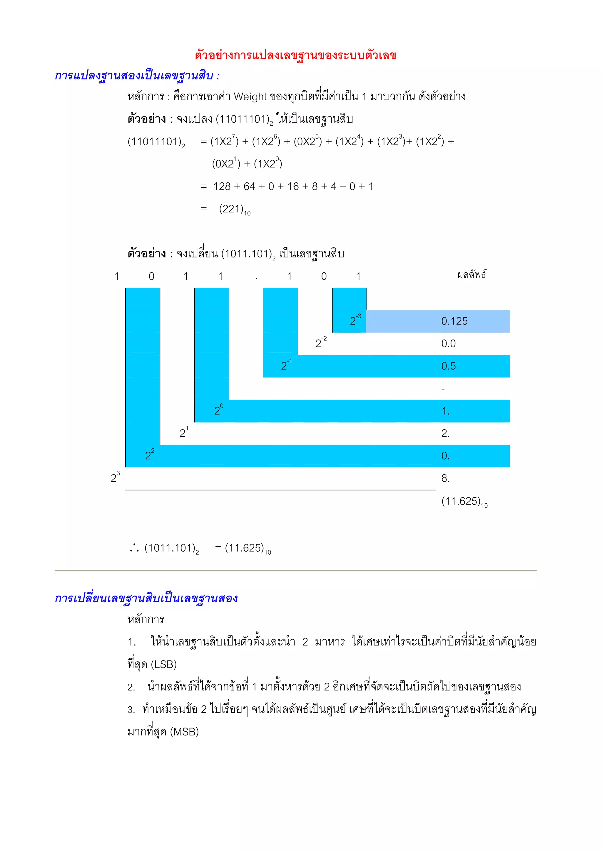 1. The document discusses converting between binary, decimal, and hexadecimal number systems by explaining place value and how to perform conversions using addition and multiplication by powers of two.