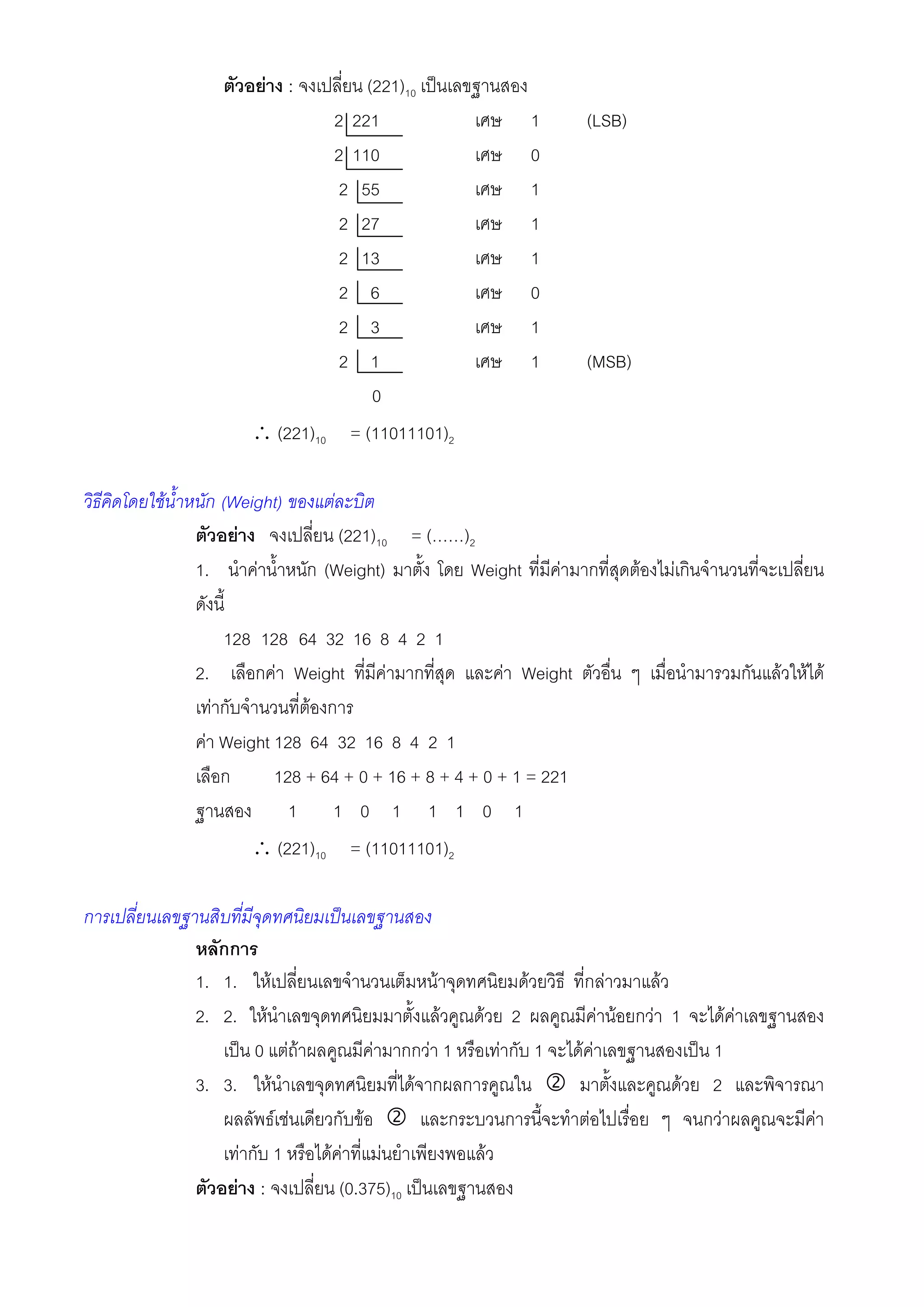 2. It provides examples of converting specific values such as 221 between decimal and binary as well as between decimal, binary, and hexadecimal.