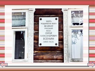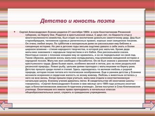 Документ содержит информацию о детстве и юности Сергея Александровича Есенина, его воспитании, влиянии семьи и народного творчества на его развитие. В нем рассказывается о творчестве поэта и его философских взглядах, выраженных в стихах и поэмах. Кроме того, упоминаются мероприятия, посвященные 115-летию со дня рождения Есенина в Рязани.