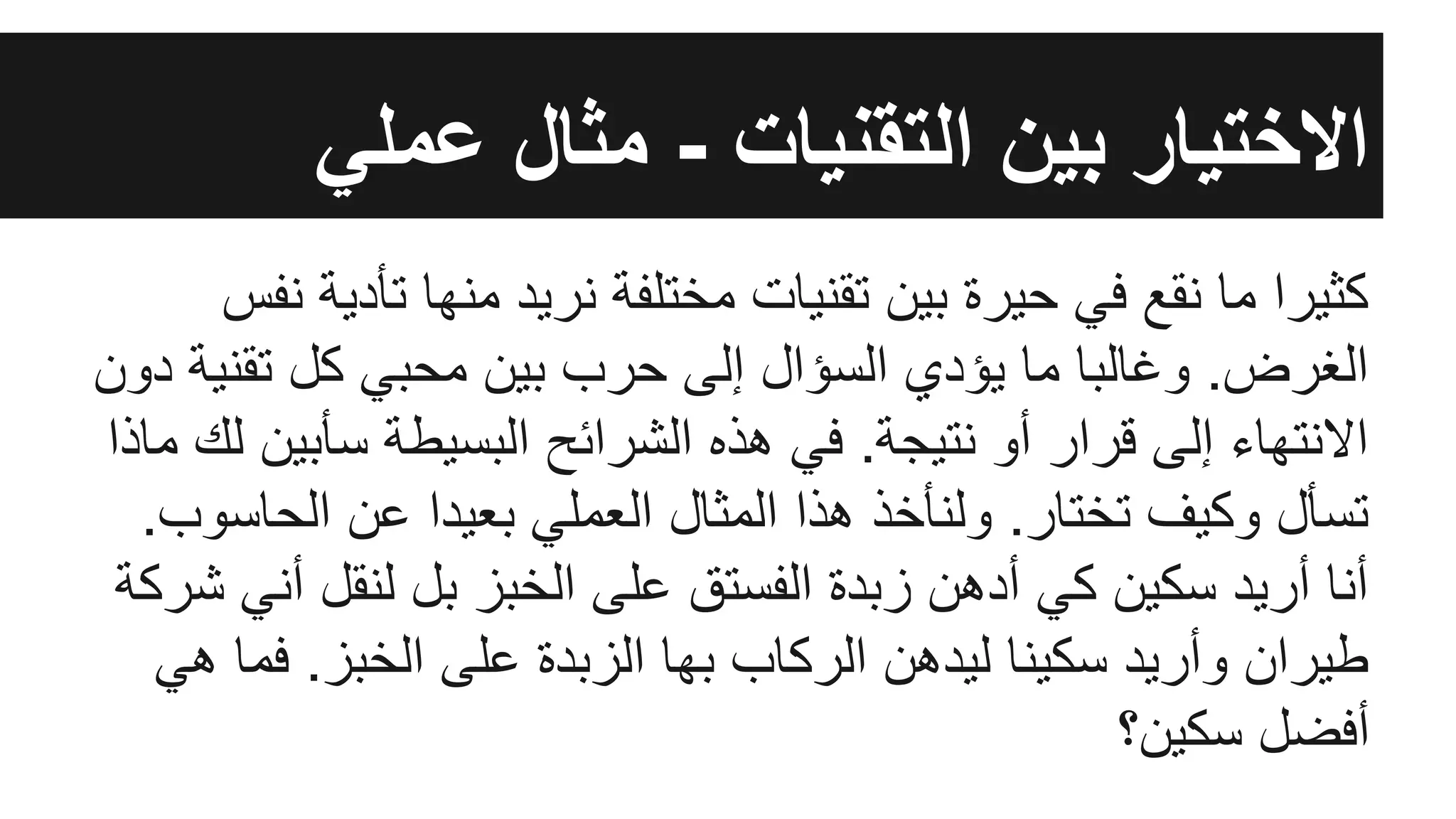 اﻟﺗﻘﻧﯾﺎت ﺑﯾن اﻻﺧﺗﯾﺎر ﻧﻔس ﺗﺄدﯾﺔ ﻣﻧﮭﺎ ﻧرﯾد ﻣﺧﺗﻠﻔﺔ ﺗﻘﻧﯾﺎت ﺑﯾن ﺣﯾرة ﻓﻲ ﻧﻘﻊ ﻣﺎ ﻛﺛﯾرا دون ﺗﻘﻧﯾﺔ ﻛل ﻣﺣﺑﻲ ﺑﯾن ﺣرب إﻟﻰ اﻟﺳؤال ﯾؤدي ﻣﺎ وﻏﺎﻟﺑﺎ .اﻟﻐرض ﻣﺎذا ﻟك ﺳﺄﺑﯾن اﻟﺑﺳﯾطﺔ اﻟﺷراﺋﺢ ھذه ﻓﻲ .ﻧﺗﯾﺟﺔ أو ﻗرار إﻟﻰ اﻻﻧﺗﮭﺎء .اﻟﺣﺎﺳوب ﻋن ﺑﻌﯾدا اﻟﻌﻣﻠﻲ اﻟﻣﺛﺎل ھذا وﻟﻧﺄﺧذ .ﺗﺧﺗﺎر وﻛﯾف ﺗﺳﺄل ﺷرﻛﺔ أﻧﻲ ﻟﻧﻘل ﺑل اﻟﺧﺑز ﻋﻠﻰ اﻟﻔﺳﺗق زﺑدة أدھن ﻛﻲ ﺳﻛﯾن أرﯾد أﻧﺎ ھﻲ ﻓﻣﺎ .اﻟﺧﺑز ﻋﻠﻰ اﻟزﺑدة ﺑﮭﺎ اﻟرﻛﺎب ﻟﯾدھن ﺳﻛﯾﻧﺎ وأرﯾد طﯾران ﺳﻛﯾن؟ أﻓﺿل