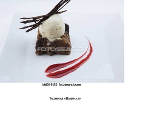 Документ описывает различные техники оформления десертов, такие как «графика», «выемка», и «вымазка», а также методы подачи, включая использование шоколадных формочек и вафельных палочек. Он упоминает ингредиенты и декоративные элементы, такие как шоколадные сердца и мармеладные шарики. Текст также акцентирует внимание на художественных техниках, доступных только для опытных кондитеров.