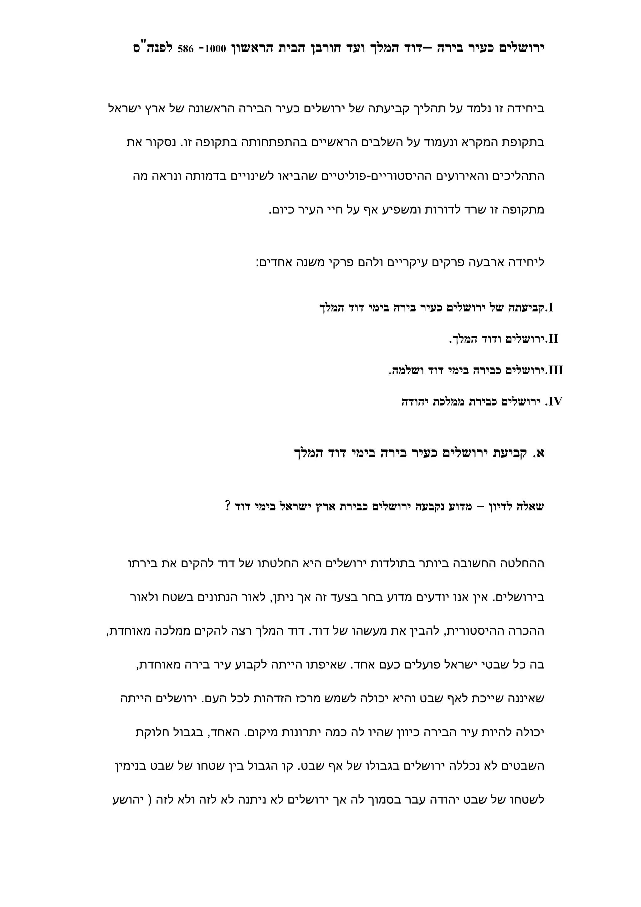 ביחידה זו נלמד על תהליך קביעתה של ירושלים כעיר הבירה הראשונה של ארץ ישראל