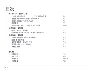 二次利用の促進 P4 目指すべきデータの構造やデータ形式 P5 自治体が行うメリット・デメリット P6 活用事例 P7 民間から求められているオープンデータ P8-P9 世界における取組 G8オープンデータ憲章 P11 G8で重要視されるデータ 主要14カテゴリー P12 日本における取組 オープンデータに関わる国内動向 P14 国会・委員会発言 P15 省庁で進むオープンデータ化 P16 埼玉県で行われているRSS P17 取組自治体 P18 その他 用語解説 P28 XMLについて P29 参考資料 P30-32 企業概要 P33