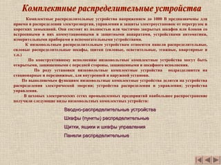 Документ описывает вводно-распределительные устройства напряжением до 1000 В, их назначение, конструктивные особенности и классификацию по установке и функциям. Открытые, закрытые и комбинированные устройства используются для приема и распределения электроэнергии, защиты от перегрузок и коротких замыканий в электрических сетях. Также рассматриваются различные виды выключателей, контакторов и пускателей, которые применяются для управления и защиты электрических установок.