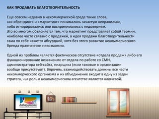 Документ излагает концепцию брендрайзинга в сфере благотворительности, подчеркивая важность эффективного маркетинга и создания сильного имиджа для некоммерческих организаций. Он анализирует современные подходы к брендингу, акцентируя внимание на интеграции всех коммуникационных каналов и целевой аудитории. Основное внимание уделяется созданию доверительных отношений с сообществом через качественный дизайн и использование социальных медиа.