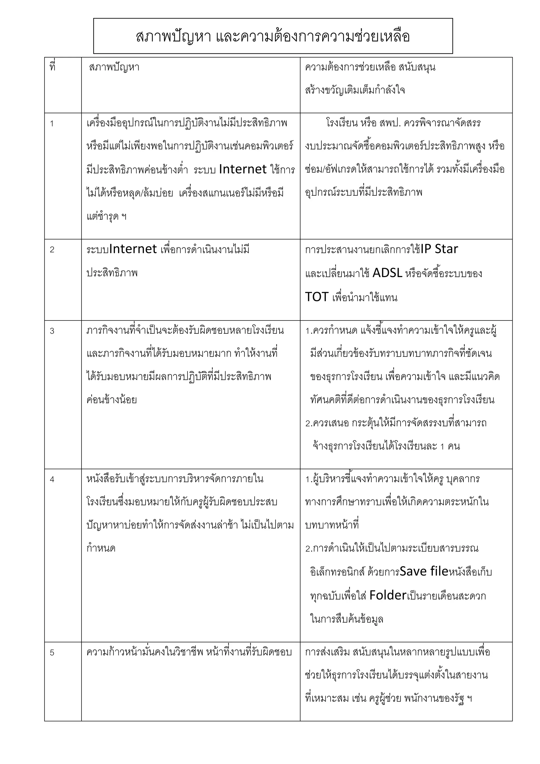 ความต้องการช่วยเหลือ สนับสนุน สร้างขวัญเติมเต็มกาลังใจ 1 เครื่องมืออุปกรณ์ในการปฏิบัติงานไม่มีประสิทธิภาพ หรือมีแต่ไม่เพียงพอในการปฏิบัติงานเช่นคอมพิวเตอร์ มีประสิทธิภาพค่อนข้างต่า ระบบ Internet ใช้การ ไม่ได้หรือหลุด/ล้มบ่อย เครื่องสแกนเนอร์ไม่มีหรือมี แต่ชารุด ฯ โรงเรียน หรือ สพป. ควรพิจารณาจัดสรร งบประมาณจัดซื้อคอมพิวเตอร์ประสิทธิภาพสูง หรือ ซ่อม/อัฟเกรดให้สามารถใช้การได้ รวมทั้งมีเครื่องมือ อุปกรณ์ระบบที่มีประสิทธิภาพ 2 ระบบInternet เพื่อการดาเนินงานไม่มี ประสิทธิภาพ การประสานงานยกเลิกการใช้IP Star และเปลี่ยนมาใช้ ADSL หรือจัดซื้อระบบของ TOT เพื่อนามาใช้แทน 3 ภารกิจงานที่จาเป็นจะต้องรับผิดชอบหลายโรงเรียน และภารกิจงานที่ได้รับมอบหมายมาก ทาให้งานที่ ได้รับมอบหมายมีผลการปฏิบัติที่มีประสิทธิภาพ ค่อนข้างน้อย 1.ควรกาหนด แจ้งชี้แจงทาความเข้าใจให้ครูและผู้ มีส่วนเกี่ยวข้องรับทราบบทบาทภารกิจที่ชัดเจน ของธุรการโรงเรียน เพื่อความเข้าใจ และมีแนวคิด ทัศนคติที่ดีต่อการดาเนินงานของธุรการโรงเรียน 2.ควรเสนอ กระตุ้นให้มีการจัดสรรงบที่สามารถ จ้างธุรการโรงเรียนได้โรงเรียนละ 1 คน 4 หนังสือรับเข้าสู่ระบบการบริหารจัดการภายใน โรงเรียนซึ่งมอบหมายให้กับครูผู้รับผิดชอบประสบ ปัญหาหาบ่อยทาให้การจัดส่งงานล่าช้า ไม่เป็นไปตาม กาหนด 1.ผู้บริหารชี้แจงทาความเข้าใจให้ครู บุคลากร ทางการศึกษาทราบเพื่อให้เกิดความตระหนักใน บทบาทหน้าที่ 2.การดาเนินให้เป็นไปตามระเบียบสารบรรณ อิเล็กทรอนิกส์ ด้วยการSave fileหนังสือเก็บ ทุกฉบับเพื่อใส่ Folderเป็นรายเดือนสะดวก ในการสืบค้นข้อมูล 5 ความก้าวหน้ามั่นคงในวิชาชีพ หน้าที่งานที่รับผิดชอบ การส่งเสริม สนับสนุนในหลากหลายรูปแบบเพื่อ ช่วยให้ธุรการโรงเรียนได้บรรจุแต่งตั้งในสายงาน ที่เหมาะสม เช่น ครูผู้ช่วย พนักงานของรัฐ ฯ