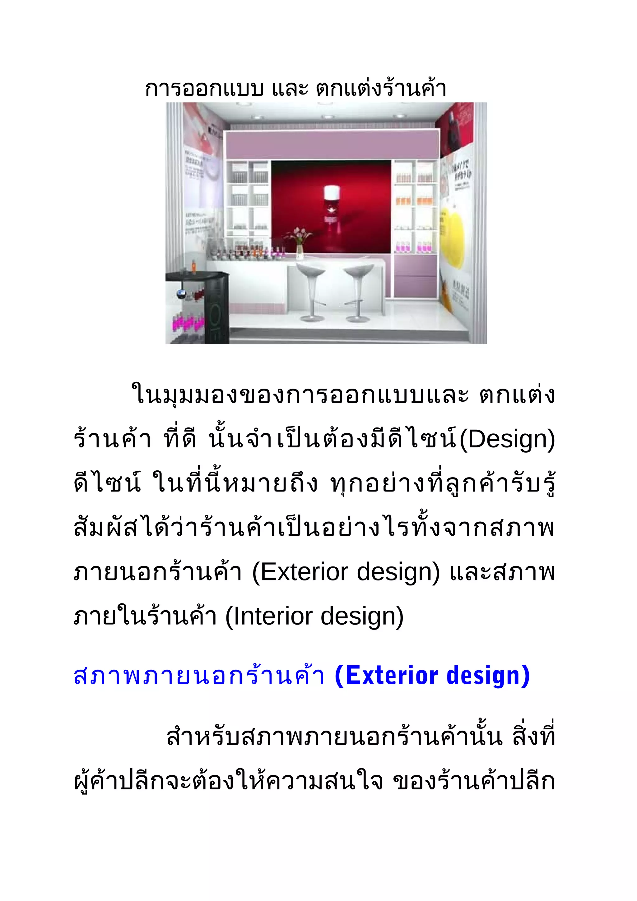 (ตอนที่2) ในตอนที่แล้วพูดถึงมุมมองของ การ ออกแบบและ ตกแต่งร้านค้า จากสภาพ ภายนอกร้านค้า (Exterior design) ไปแล้ว เหลืออีกสิ่งที่เราต้องคำานึงถึงเป็นอย่างยิ่ง นั้นก็ คือ สภาพภายในร้านค้า (Interior design)