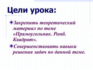 Урок посвящен теме 'прямоугольник, ромб, квадрат', с целью закрепления теоретического материала и улучшения навыков решения задач. План включает теоретическую самостоятельную работу, проверочный тест и самостоятельную работу с подведением итогов. В документе представлены задания и тесты, а также домашнее задание на изучение дополнительных задач.