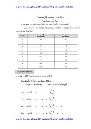 http://e-learning.pbtc.ac.th/~kantaya/file.php/1/unit1/unit1.doc http://e-learning.pbtc.ac.th/~kantaya/file.php/1/unit1/unit1.doc ๕ ใบความรู้ที่๒ แผนการสอนที่ ๑ เรื่องเสียงและอักษรไทย ๒