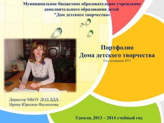 В 2013-2014 учебном году в доме детского творчества занимались 1549 детей, охватывающих различные направления, такие как художественно-эстетическое и физкультурно-спортивное. Педагогический состав учреждения включает 44 человека, из которых 8 имеют высшую квалификационную категорию, и многие принимают участие в конкурсах различного уровня. Также были организованы разнообразные мероприятия, выставки и акции для детей и родителей, направленные на социализацию и развитие творческих способностей.