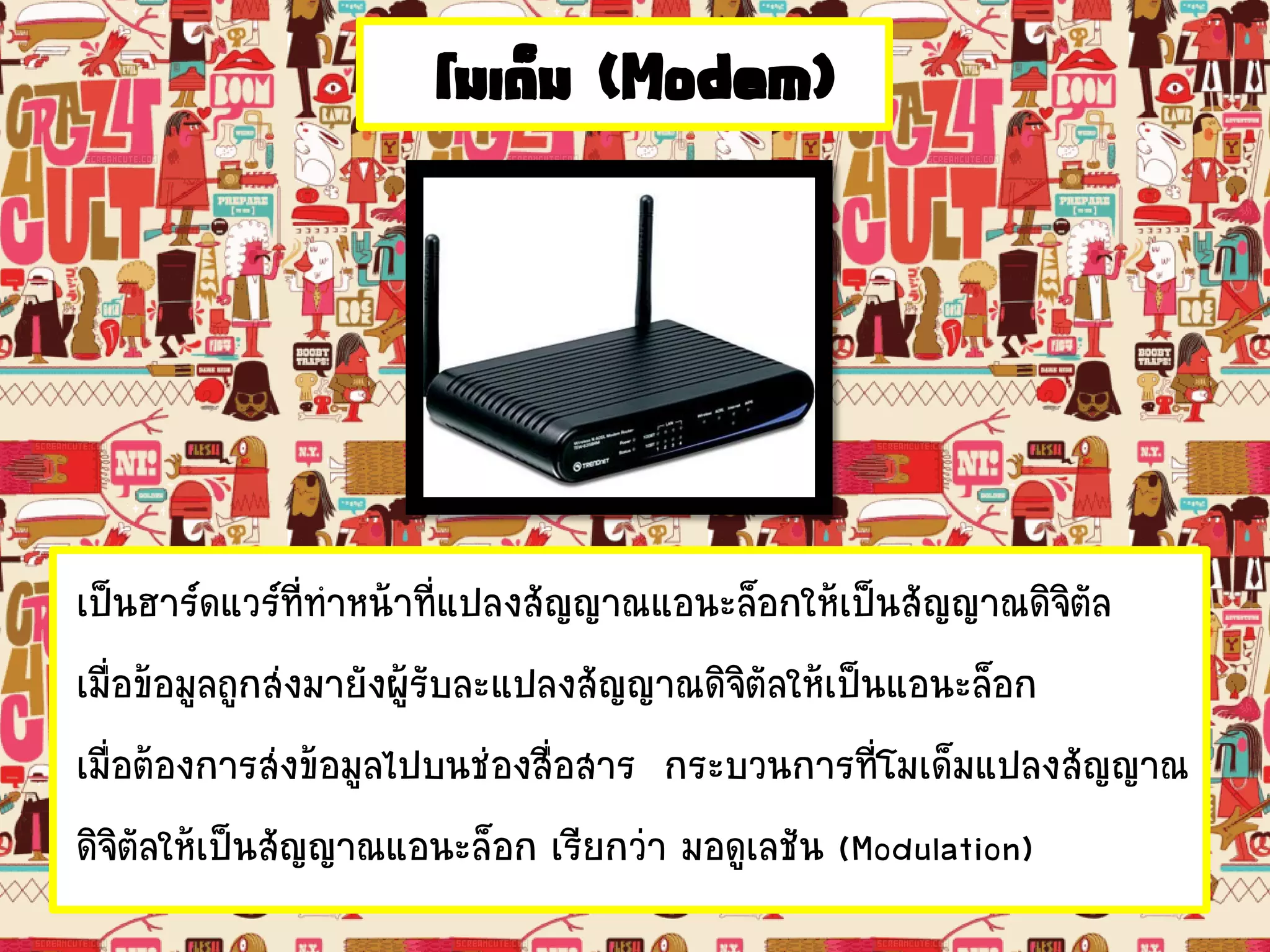 โมเด็ม (Modem) เป็นฮาร์ดแวร์ที่ทาหน้าที่แปลงสัญญาณแอนะล็อกให้เป็นสัญญาณดิจิตัล เมื่อข้อมูลถูกส่งมายังผู้รับละแปลงสัญญาณดิจิตัลให้เป็นแอนะล็อก เมื่อต้องการส่งข้อมูลไปบนช่องสื่อสาร กระบวนการที่โมเด็มแปลงสัญญาณ ดิจิตัลให้เป็นสัญญาณแอนะล็อก