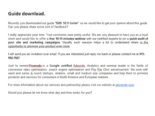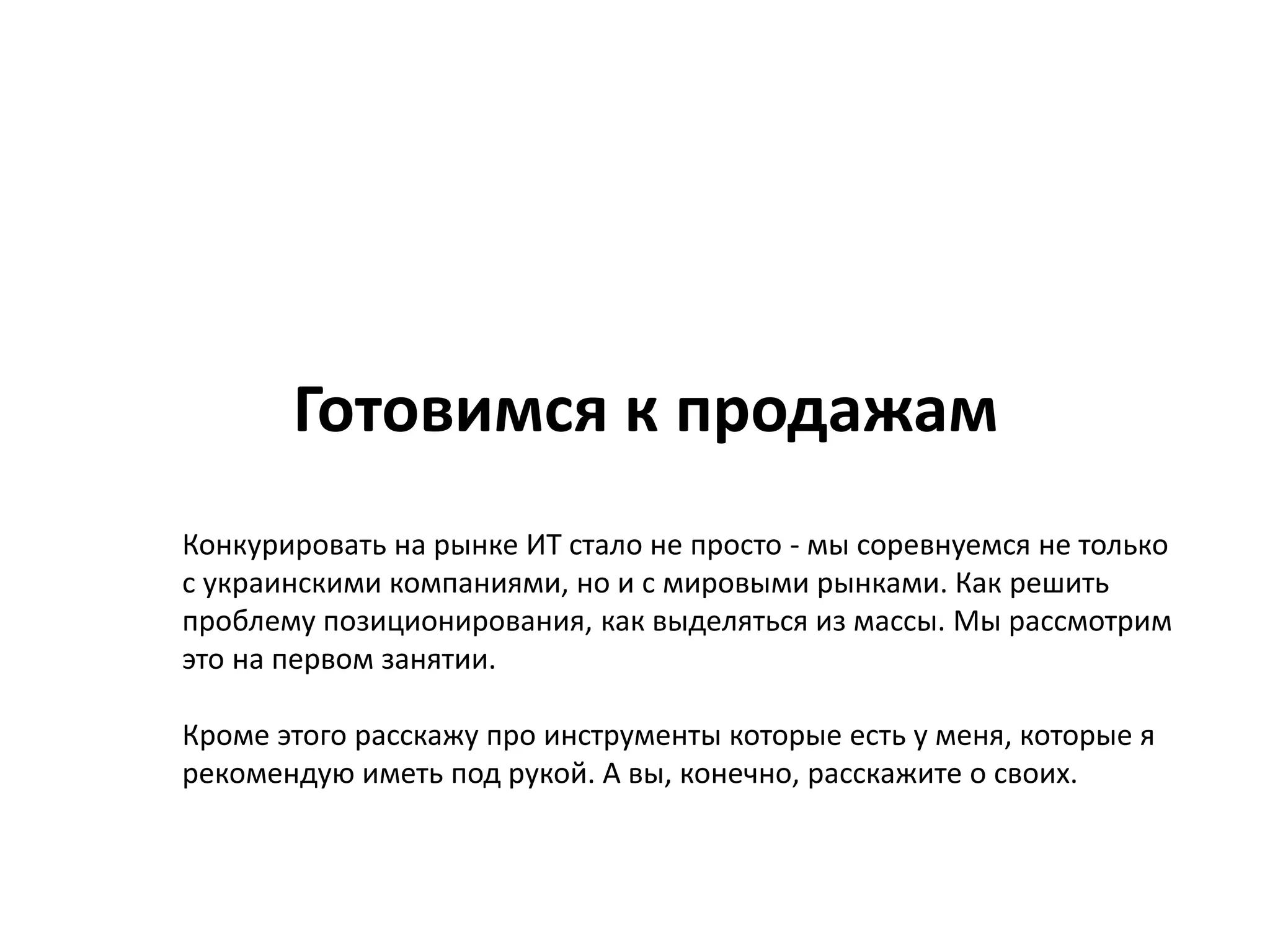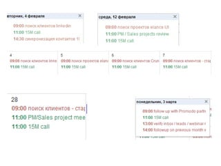 Документ обсуждает стратегию продаж в условиях конкурентного рынка, акцентируя внимание на необходимостях клиентов и активной позиции компаний. Рассматриваются важные инструменты для успешного ведения бизнеса, такие как CRM-системы, а также принципы upsale и коммуникации с клиентами. Автор делится личным опытом и подходами к построению эффективной системы продаж без заспамленных планов и подтверждает важность мотивации сотрудников.