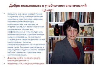 Учебно-лингвистический центр при Санкт-Петербургском государственном университете низкотемпературных и пищевых технологий предлагает программу обучения «переводчик в сфере профессиональной коммуникации» с аккредитацией и лицензией. Обучение длится 3 года, начинается при наборе групп и включает бесплатное тестирование для зачисления. Выпускники получают диплом о дополнительном образовании и обладают конкурентоспособными навыками для работы в зарубежных фирмах и совместных предприятиях.