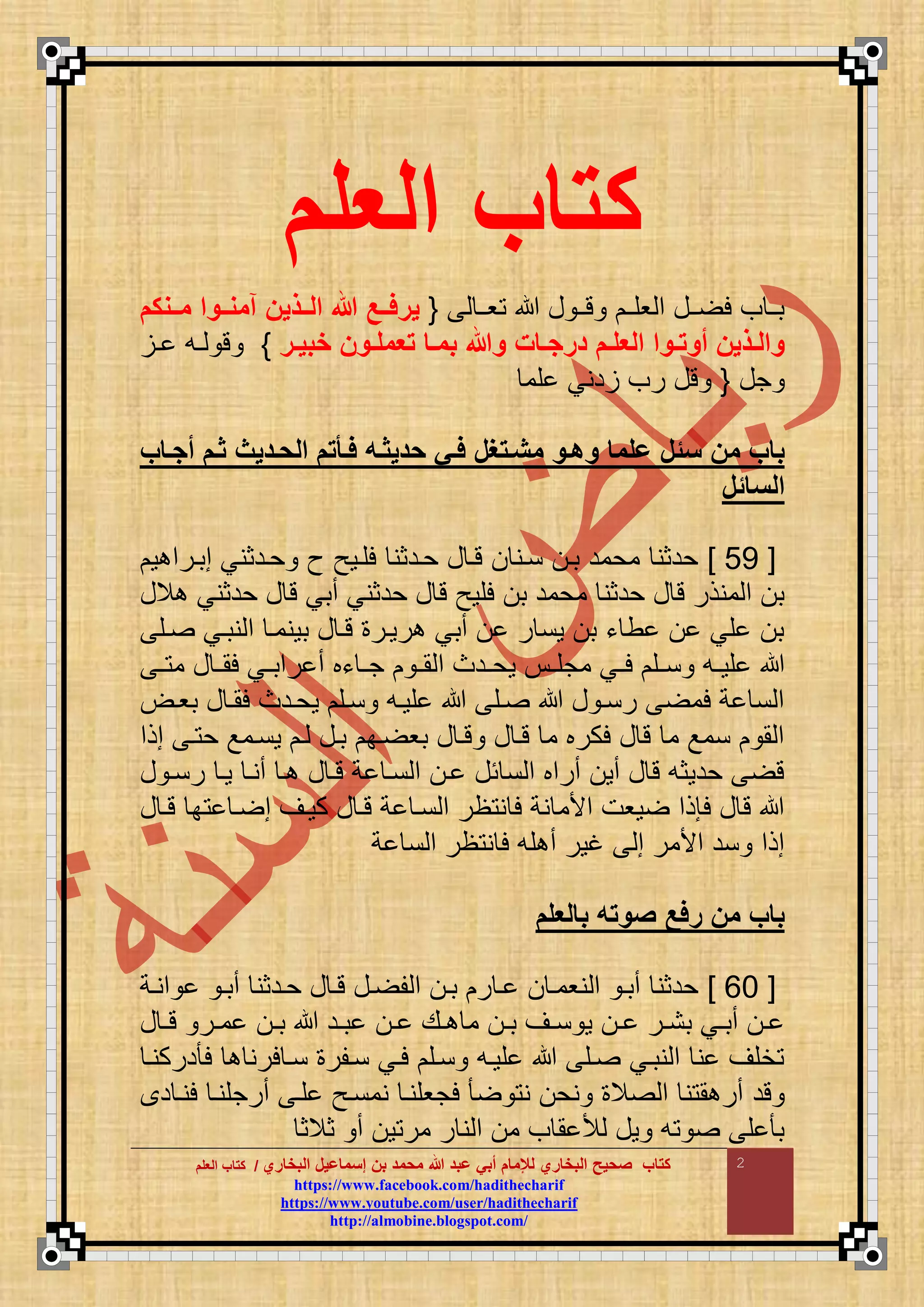 يتناول المستند موضوع البخاري وإسهاماته في مجال الحديث. الوثيقة تشير إلى أهمية الكتاب كمصدر رئيسي لعلوم الدين. كما تسلط الضوء على تحسين الفهم ومعرفة النوادر المتعلقة بالعالم الإسلامي.