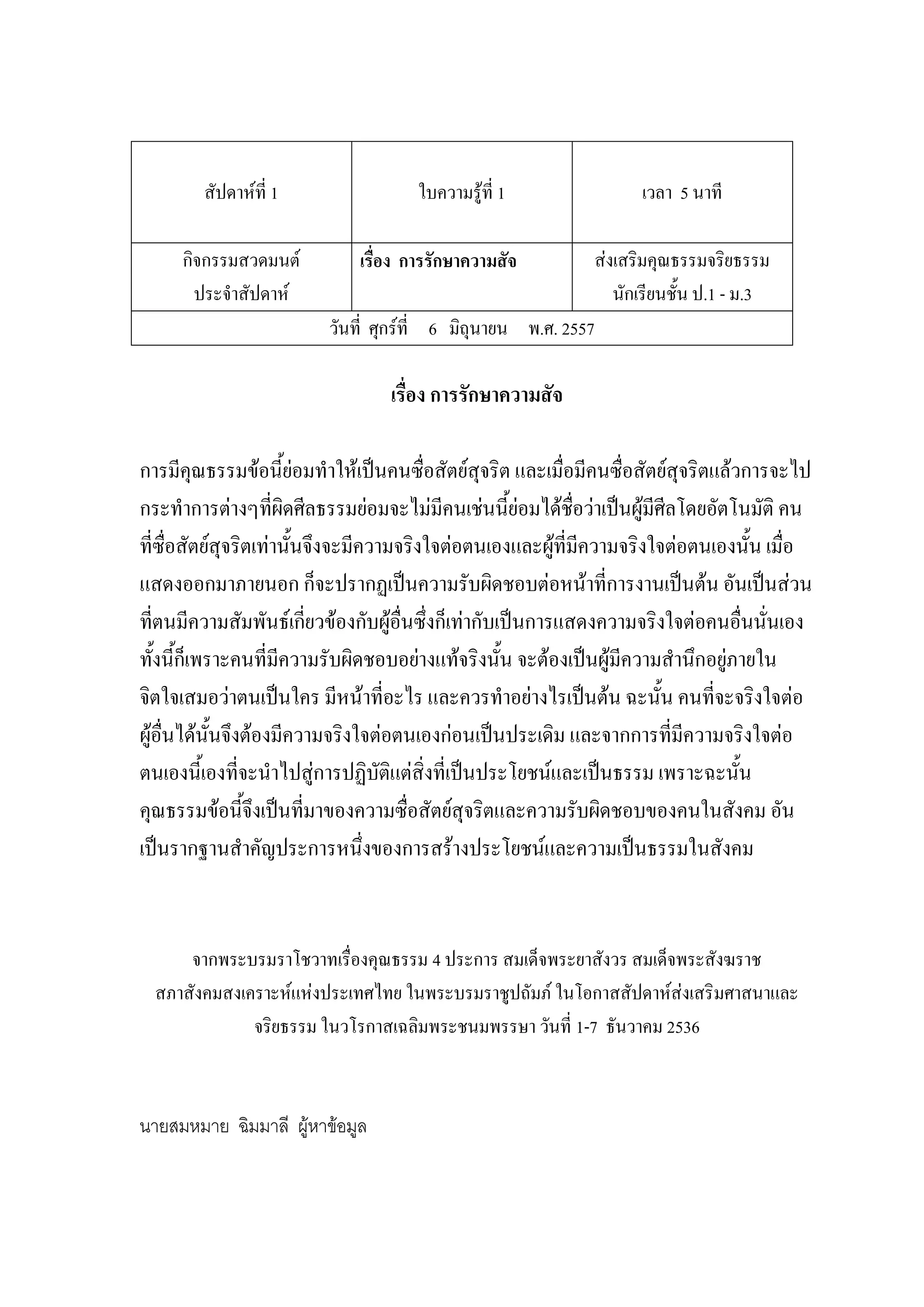 37 เวลา 5 นาที กิจกรรมสวดมนต์ประจํา สัปดาห์ เรื่อง ความสุจริต ส่งเสริมคุณธรรมจริยธรรม นักเรียนชั้น ป.1 - ม.3 วันศุกร์ที่ 27 มีนาคม พ.ศ. 2558 เรื่องความสุจริต นักเรียนที่รักทุกคน เวลานี้ มีสิ่งที่หาได้ยากยิ่ง ขึ้นทุกวันในโลกของเรา เหมือนกับงมเข็มในมหาสมุทร สิ่งนั้น คือ ความสุจริต ในทุกวงการในทุกสังคม ต่างก็ต้องการและแสวงหาความสุจริตกันทั้งนั้น แต่ ความสุจริตก็ยังหาได้ยากเต็มที เมื่อหาได้ยาก ความเดือดร้อนจึงเกิดขึ้นทุกหย่อมหญ้า ความ หวาดระแวง ความเอารัดเอาเปรียบกันจึงระบาดไปทั่วทุกหนทุกแห่ง สําหรับคนที่ยังมั่นคงอยู่ใน ความสุจริตนั้นต่างก็อยู่อย่างเจียมเนื้อเจียมตัว อยู่อย่างไม่สบายใจนัก ต้องถูกกระแหนะกระแหน ก้าวร้าวให้หมดกําลังใจไปเรื่อยๆ โดยไม่มีทางตอบโต้ จนคนสุจริตบางคนทนสภาพไม่ไหวต้อง ยอมเป็น หมาหางด้วน ไปกะเขาด้วยอย่างน่าเสียดาย คงเหลือแต่คนที่จิตใจมั่นคงจริงๆ เท่านั้น จึงจะครองความสุจริตไว้ได้ คนอย่างนี้แหละนักเรียนที่น่ายกย่องอย่างแท้จริง ไหว้ได้เต็มมือ นับ ถือได้เต็มใจ ขอให้นักเรียนยึดถือเป็นแบบ แท้จริงแล้ว ความสุจริตนั้นเป็นเกราะป้องกันตัวเราได้ คือป้องกันเรามิให้ตกไปในบ่วง แห่งความชั่วทุจริต มิให้ตกอยู่ในวังวนแห่งความเลวร้ายในสังคม ทําให้ปลอดภัยจากการถูก กล่าวหาถูกใส่ร้ายป้ายสี หรือถูกลงโทษ ผู้มั่นคงอยู่ในความสุจริตย่อมได้รับความนับถือจากคน ทั่วไปไปไหนมาไหนก็ไม่ต้องหวาดระแวง ทํามาหากินอะไรก็ทําได้โกยเปิดเผย ความสุจริตเป็น เหตุให้คนเราเป็นอยู่อย่างปกติสุข ไม่มีเวรมีภัยกับใคร ความสุจริตดีอย่างนี้ นักเรียนควรยึดถือไว้ ให้มั่น แม้จะต้องฝืนใจและอดทนประพฤติก็คุ้ม พระธรรมกิตติวงศ์ ( ทองดี สุรเตโช ป.ธ.9 ราชบัณฑิต) คําพ่อ คําแม่ พิมพ์ครั้งที่ 1 กรุงเทพฯ เลี่ยงเซียง 2544 216 หน้า