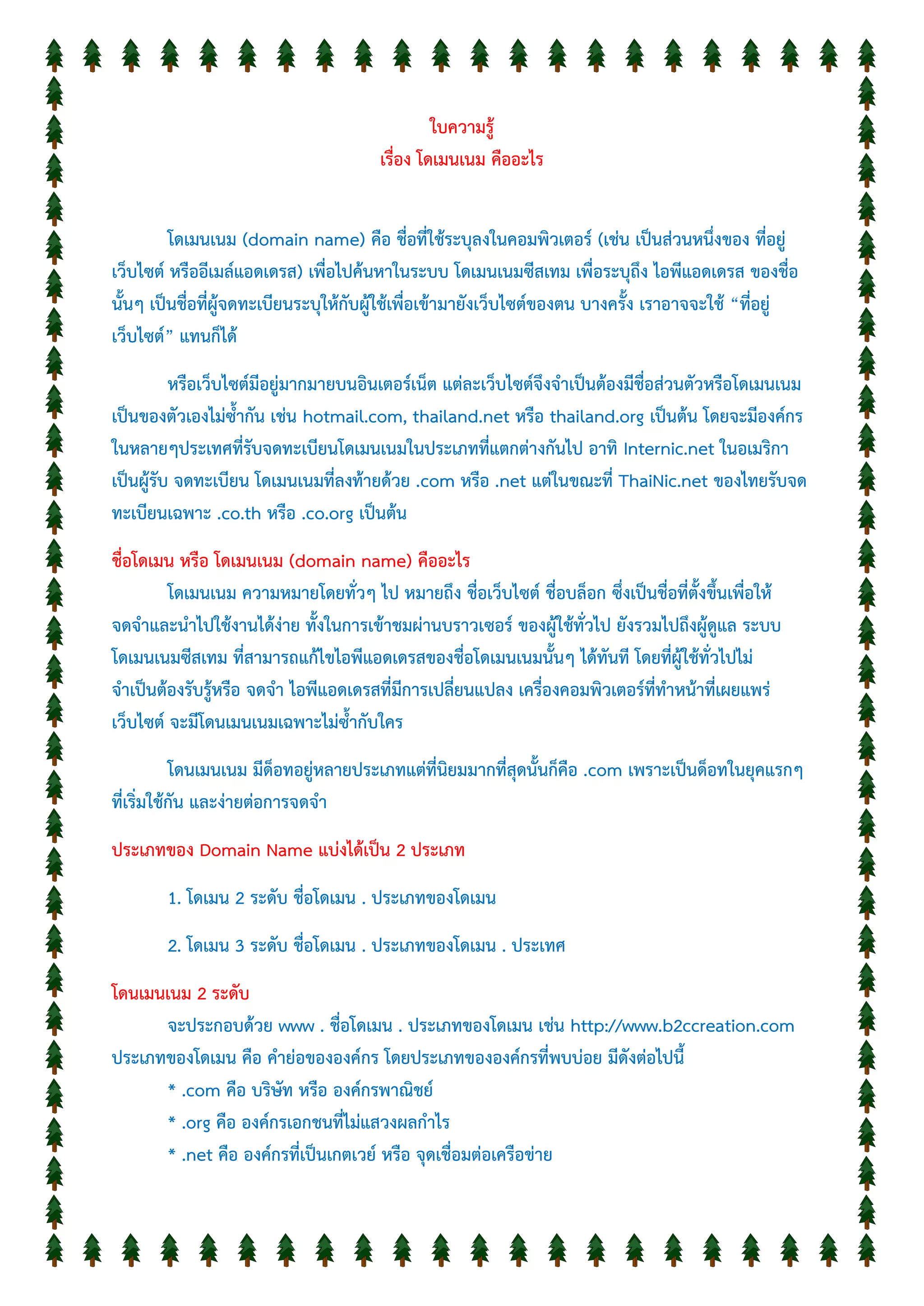 สถาบันการศึกษา * .gov คือ องค์กรของรัฐบาล * .mil คือ องค์กรทางทหาร โดนเมนเนม 3 ระดับ จะประกอบด้วย www . ชื่อโดเมน . ประเภทของโดเมน . ประเทศ เช่น http://www.kmitnb.ac.th, http://www.nectec.or.th, http://www.google.co.th ประเภทของ องค์กรที่พบบ่อยคือ * .co คือ บริษัท หรือ องค์กรพาณิชย์ * .ac คือ สถาบันการศึกษา * .go คือ องค์กรของรัฐบาล * .net คือ องค์กรที่ให้บริการเครือข่าย * .or คือ องค์กรเอกชนที่ไม่แสวงผลกาไรตัวย่อของประเทศที่ตั้งขององค์กร * .th คือ ประเทศไทย * .cn คือ ประเทศจีน * .uk คือ ประเทศอังกฤษ * .jp คือ ประเทศญี่ปุ่น * .au คือ ประเทศออสเตรเลีย โดเมนเนม ถือเป็นสิ่งสาคัญอันดับแรกที่มองข้ามไม่ได้เลยสาหรับเว็บไซต์นั้นๆ โดยเฉพาะกับการ โฆษณาบนอินเตอร์เน็ท ถ้าได้ชื่อที่เฉพาะเจาะจง ตรงกับกลุ่มเป้าหมาย ที่มีความสนใจเป็นพื้นฐานเดิมอยู่ แล้วนั้น จะทาให้โดเมนเนม หรือ เว็บไซต์นั้นๆ จะได้รับความสนใจและเป็นที่จดจาได้ง่ายไม่ใช่กับผู้เข้าชม หรือ กลุ่มเป้าหมายที่เข้ามาชมเว็บไซต์ผ่านโดมเนมเท่านั้นยังรวมไปถึง Search Engine ชื่อดังต่างๆ เช่น Google Yahoo MSN เป็นต้น ที่จะเข้ามาแวะเวียนเข้ามาทา index กับเว็บเพจหน้าต่างๆ ในเว็บไซต์ ของเรา ขอบคุณข้อมูลจาก http://www.b2ccreation.com/ สรุป ชื่อ โดเมน หรือ โดเมนเนม (domain name) หมายถึง ชื่อที่ใช้ระบุลงในคอมพิวเตอร์ (เช่น เป็น ส่วนหนึ่งของที่อยู่เว็บไซต์ หรืออีเมล์แอดเดรส) เพื่อไปค้นหาในระบบ โดเมนเนมซีสเทม เพื่อระบุถึง ไอพี แอดเดรส ของชื่อนั้นๆ เป็นชื่อที่ผู้จดทะเบียนระบุให้กับผู้ใช้เพื่อเข้ามายังเว็บไซต์ ของตน บางครั้งเรา อาจจะใช้ “ที่อยู่เว็บไซต์” แทนก็ได้ โดเมนเนม หรือ ชื่อโดเมน เป็นชื่อที่ตั้ง ขึ้นเพื่อให้ง่ายต่อการจดจา เนื่องจากไอพีแอดเดรสนั้นจดจาได้ยากกว่า และเมื่อการเปลี่ยนแปลง ไอพีแอดเดรส ผู้ใช้ไม่จาเป็นต้องรับรู้ หรือจดจาไอพีแอดเดรสใหม่ ยังคงใช้โดเมนเนมเดิมได้ต่อไป อักขระที่จะใช้ในการตั้งชื่อ โดเมนเนม ได้แก่