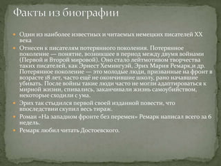 Эрих Мария Ремарк был немецким писателем, представителем 'потерянного поколения', отражая ужас войны в своих произведениях, таких как 'На западном фронте без перемен'. Его романы исследуют чувства и страдания людей, прошедших через войну, подчеркивая тему дружбы и любви на фоне послевоенного кризиса. Ремарк также сталкивался с личными трагедиями и общественными обвинениями, что усилило его литературное наследие.