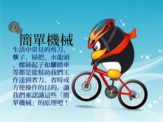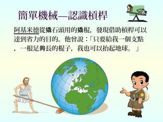 本文介绍了简单机械的概念及其原理,特别是槓桿的类型与运用。通过实验,阐释了施力与抗力的关系,以及如何通过调整施力臂和抗力臂来实现省力或提高效率。文中还探讨了轮轴作为简单机械的一种典型实例,说明了其在生活中的应用。