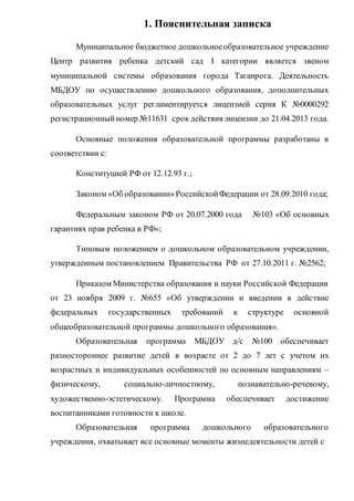 Документ представляет собой пояснительную записку для муниципального дошкольного образовательного учреждения, регламентирующую его деятельность в рамках системы образования Таганрога. Основная цель образовательного процесса - развитие детей 2-7 лет, подготовка их к школе и охрана здоровья, с акцентом на индивидуальные особенности каждого воспитанника. В документе также отражены характеристики контингента детей, состав групп и квалификационный уровень педагогов.