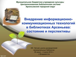 Документ рассматривает состояние и перспективы внедрения информационно-коммуникационных технологий (ИКТ) в библиотеках Арсеньева. Описывается текущее оборудование и программное обеспечение, а также недостатки существующих информационных услуг, таких как отсутствие автоматизированного поиска. В документе представлены планы по созданию электронной библиотеки, модернизации технической базы и обучению библиотечного персонала.