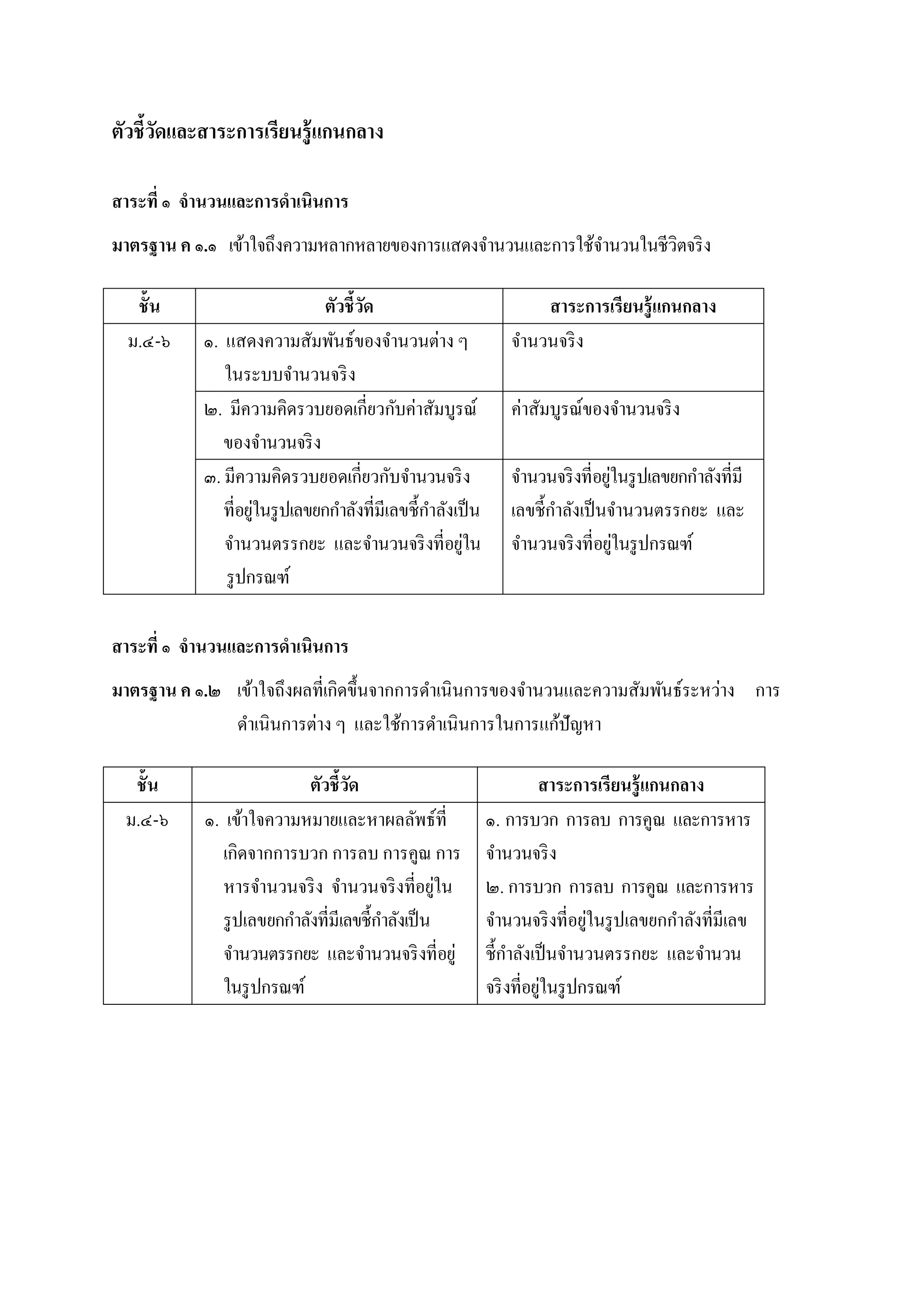 ค ๑.๑ เข้าใจถึงความหลากหลายของการแสดงจานวนและการใช้จานวนในชีวิตจริง ชั้น ตัวชี้วัด สาระการเรียนรู้แกนกลาง ม.๔-๖ ๑. แสดงความสัมพันธ์ของจานวนต่าง ๆ ในระบบจานวนจริง จานวนจริง ๒. มีความคิดรวบยอดเกี่ยวกับค่าสัมบูรณ์ ของจานวนจริง ค่าสัมบูรณ์ของจานวนจริง ๓. มีความคิดรวบยอดเกี่ยวกับจานวนจริง ที่อยู่ในรูปเลขยกกาลังที่มีเลขชี้กาลังเป็น จานวนตรรกยะ และจานวนจริงที่อยู่ใน รูปกรณฑ์ จานวนจริงที่อยู่ในรูปเลขยกกาลังที่มี เลขชี้กาลังเป็นจานวนตรรกยะ และ จานวนจริงที่อยู่ในรูปกรณฑ์ สาระที่ ๑ จานวนและการดาเนินการ มาตรฐาน ค ๑.๒ เข้าใจถึงผลที่เกิดขึ้นจากการดาเนินการของจานวนและความสัมพันธ์ระหว่าง การ ดาเนินการต่าง ๆ และใช้การดาเนินการในการแก้ปัญหา ชั้น ตัวชี้วัด สาระการเรียนรู้แกนกลาง ม.๔-๖ ๑. เข้าใจความหมายและหาผลลัพธ์ที่ เกิดจากการบวก การลบ การคูณ การ หารจานวนจริง จานวนจริงที่อยู่ใน รูปเลขยกกาลังที่มีเลขชี้กาลังเป็น จานวนตรรกยะ และจานวนจริงที่อยู่ ในรูปกรณฑ์ ๑. การบวก การลบ การคูณ และการหาร จานวนจริง ๒. การบวก การลบ การคูณ และการหาร จานวนจริงที่อยู่ในรูปเลขยกกาลังที่มีเลข ชี้กาลังเป็นจานวนตรรกยะ และจานวน จริงที่อยู่ในรูปกรณฑ์