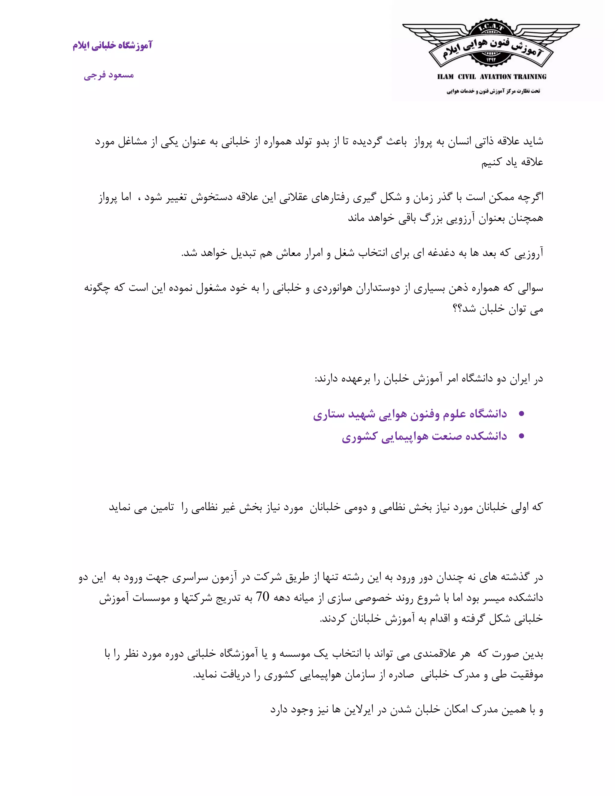 مسعود شایدعالقهذاتیانسانبهپروازباعثگردیدهتاازبدوتولدهموارهازخلبانیبهعنوانیکیازمشاغلمورد عالقهیادکنیم اگرچهممکناستتغییر دستخوش عالقه این عقالنی رفتارهای گیری شکل و زمان گذر باشود،اماپرواز همچنانبعنوانباقی بزرگ آرزوییماند خواهد آروز.شد خواهد تبدیل هم معاش امرار و شغل انتخاب برای ای دغدغه به ها بعد که یی که سوالیمشغو خود به را خلبانی و هوانوردی دوستداران از بسیاری ذهن هموارهچگونه که است این نموده ل توان میشد؟؟ خلبان خلبان آموزش امر دانشگاه دو ایران دررابردارن عهده:د دانشگاهعلوموفنونهواییشهیدستاری دانشکدهصنعتهوکشوری اپیمایی خلبانان دومی و نظامی بخش نیاز مورد خلبانان اولی کهموردنیازبخشغیرنظامیراتامیننماید می گذشته درهایبه ورود جهت سراسری آزمون در شرکت طریق از تنها رشته این به ورود دور چندان نهایندو دانشکدهمیسربودمیان از سازی خصوصی روند شروع با امادهه ه07آموزش موسسات و شرکتها تدریج به .کردند خلبانان آموزش به اقدام و گرفته شکل خلبانی که صورت بدینعالقمندی هرتواند مینظر مورد دوره خلبانی آموزشگاه یا و موسسه یک انتخاب بابا را طی موفقیتخلبانی مدرک وصادرهازسازمانهواپیماکشوری ییرادریافتنماید. ومدرک همین باامکانخلباندر شدنها ایرالیندارد وجود نیز