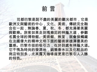 前 言 花都巴黎是說不盡的美麗的觀光都市,它是歐洲文與藝術的中心,文化、美術、傳統完全融合在一起,無論春、夏、秋、冬,都充滿著美麗與歡樂。旅客如果走到瑪樂尼的林蔭大道,參觀名震全球的博物館、美術館、教堂,就會接觸藏在法國偉大的精神文明下面的藝術家雄渾優美的靈感。巴黎市街的吸引力,在於到處有林蔭大道。它不愧為時尚的發源地,銷售香水以及化粧品的商店特別多,尤其露天咖啡座更是巴黎引人入勝的特色。