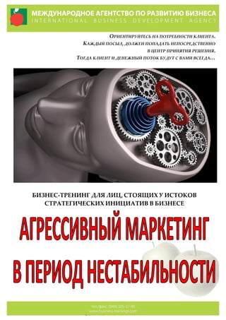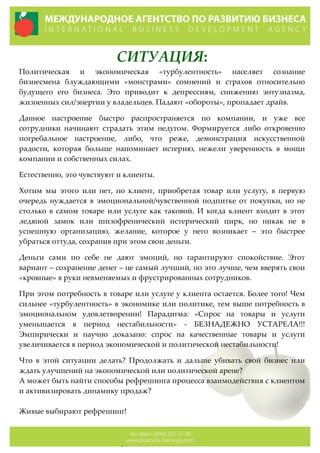 Документ представляет собой описание бизнес-тренинга, направленного на понимание процесса принятия решений клиентами в условиях экономической и политической нестабильности. Программа включает теоретические знания и практические методики, направленные на активизацию интереса клиентов к товарам и услугам. Основное внимание уделяется эмоциональному аспекты взаимодействия с клиентом и разработке эффективных маркетинговых стратегий.
