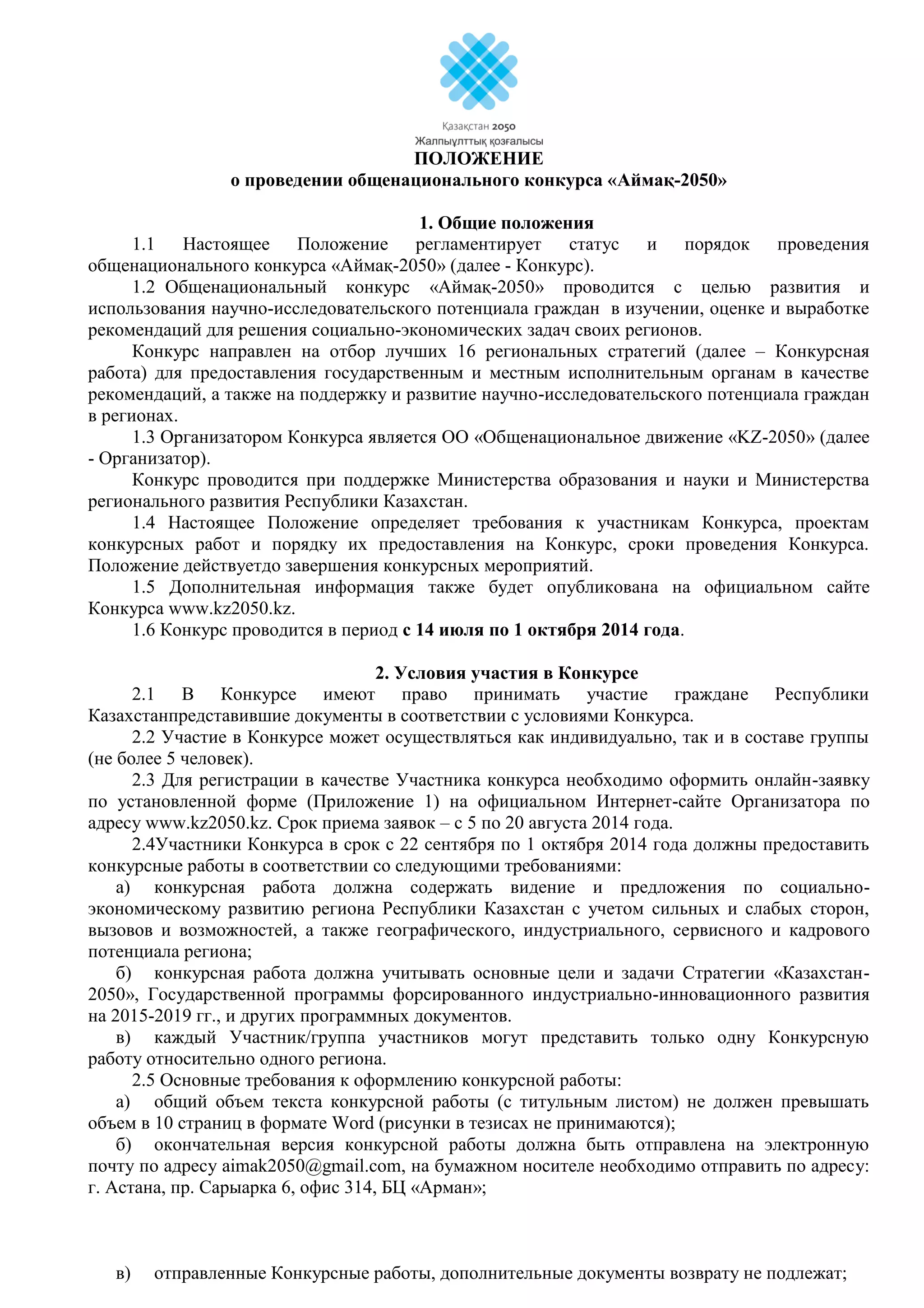 Положение о проведении общенационального конкурса «аймақ-2050» описывает цели, порядок, условия участия и этапы конкурса, направленного на разработку стратегий для социально-экономического развития регионов Казахстана. Конкурс организован движением «kz-2050» с поддержкой министерств и проводится с 14 июля по 1 октября 2014 года, включая этапы информационной кампании, тренингов и экспертного отбора работ. Участники имеют право получать призы за занятые места, и информация о конкурсе доступна на официальном сайте.