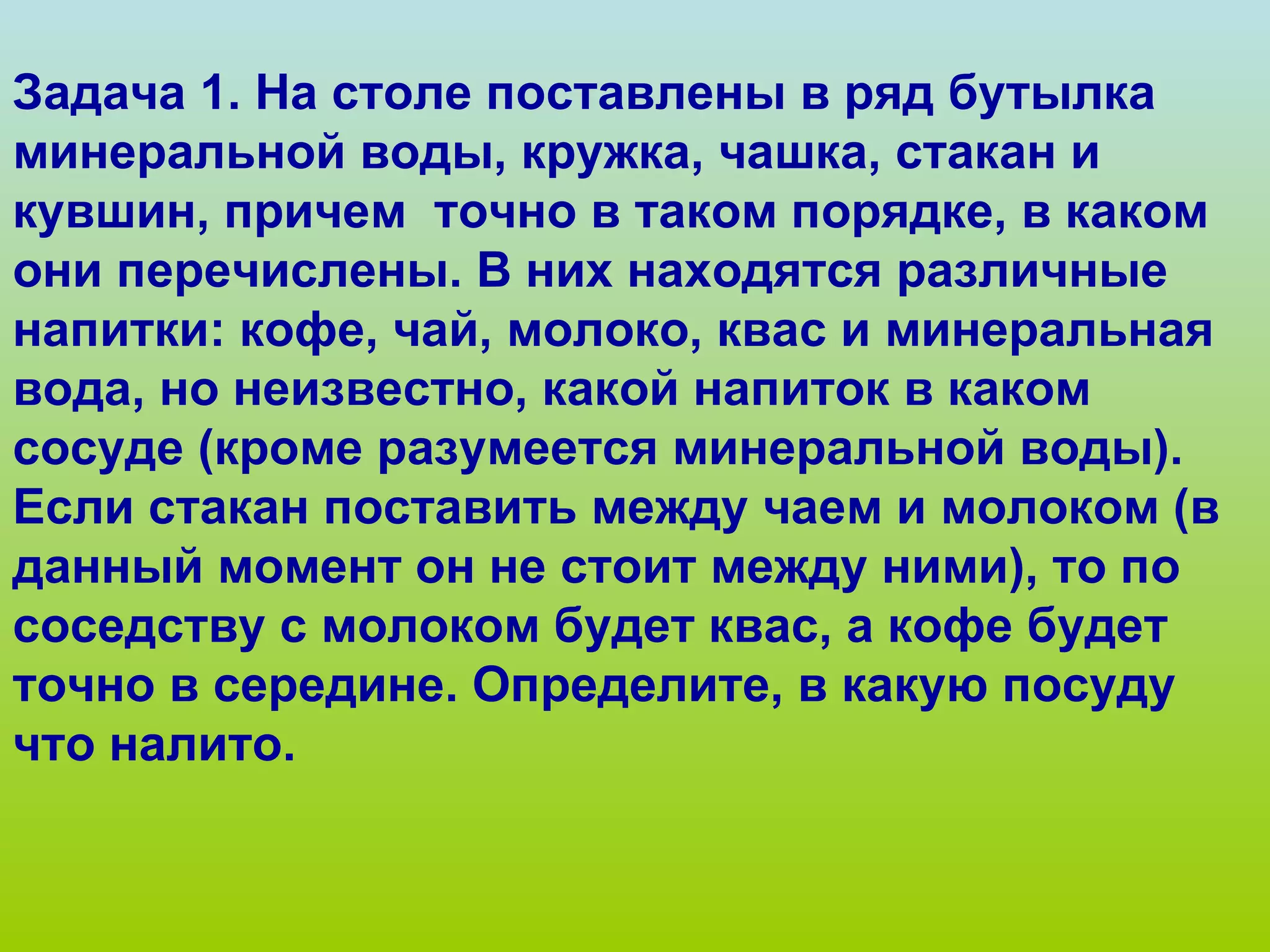 Документ содержит решение задач, связанных с определением напитков в сосудах, высоты деревьев и победителей школьных олимпиад. В первой задаче определены напитки, вторая задача выявляет самое высокое и низкое дерево, а третья задача устанавливает, кто стал победителем в олимпиадах. В результате каждая задача имеет четкие выводы и логические рассуждения.