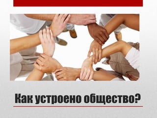 Документ рассматривает общество как сложную систему, состоящую из взаимосвязанных частей, таких как социальные институты и группы. В тексте описаны признаки и характеристики общества, включая его открытость изменениям, социальную стратификацию и виды социальной мобильности, а также роли и статусы индивидов. Рассматриваются связи между различными сферами общества, включая экономическую, политическую и духовную, а также затрагиваются аспекты человеческой деятельности и потребностей.